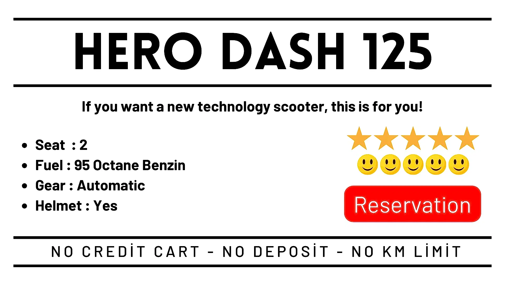 Class (A - A1 - A2) can be driven with a driver's license . Fuel is not included in the price. It is mandatory to wear a helmet. It can be used in Alanya - Oba - Tosmur - Kestel - Mahmutlar - Kargicak regions. Its use is prohibited in areas after tunnels. To make a rental, it is sufficient to come to our office with your driver's license and passport.