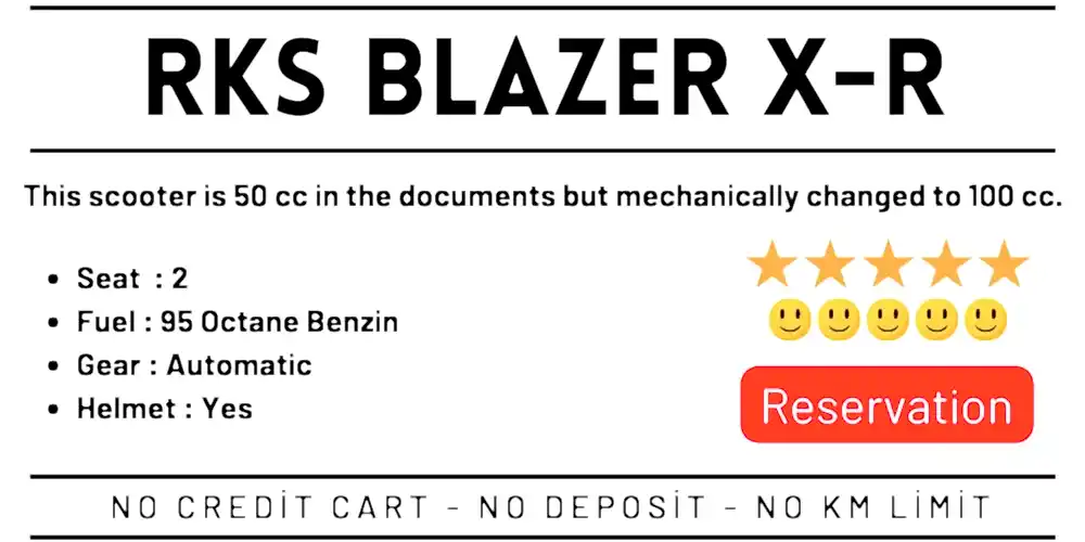 Can be used with a class AM and B car license . Fuel is not included in the price. It is mandatory to wear a helmet. It can be used in Alanya - Oba - Tosmur - Kestel - Mahmutlar - Kargicak regions. Its use is prohibited in areas after tunnels. To make a rental, it is sufficient to come to our office with your driver's license and passport.